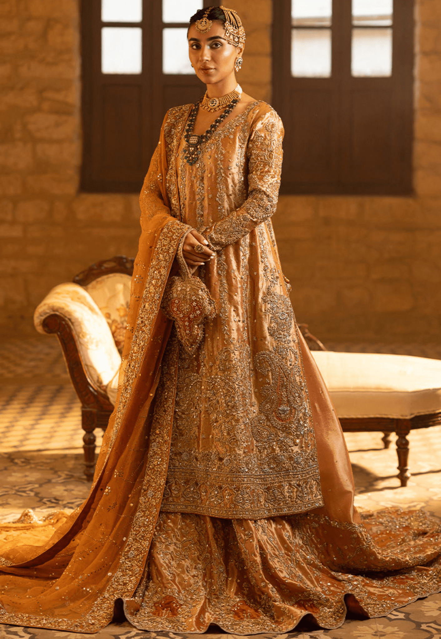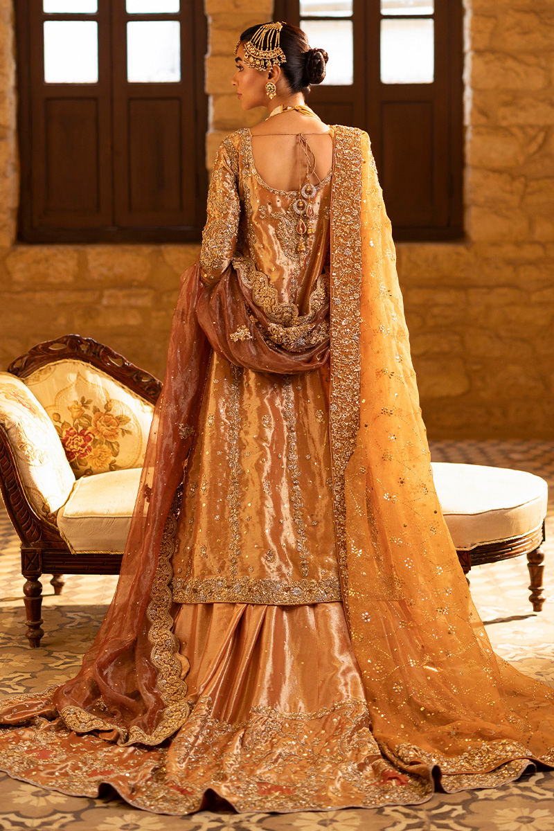 Special Embroidery handmade kora dabka zari stich The paneled burnt orange lame shirt, designed with long chaaks and fitted sleeves, is adorned with intricate paisley motifs, trellises, and heavy borders, enhanced with carrot red appliqués on the daman and sleeves. Subtle kamdani chan lends a delicate shimmer, while dori detailing at the back adds refinement. Paired with a majestic farshi extending into a long trail, the ensemble showcases peacock motifs and carrot red appliqués, intricately worked with gold and silver kaam — dabka, nakshi, sequence, tikki stones, and zari — creating depth and opulence.