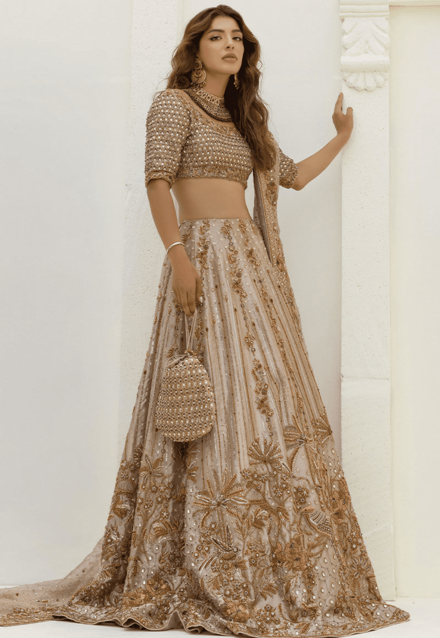 Special Embroidery handmade kora dabka zari stich A masterpiece lehnga choli of a pure lama, adorned with an intricate tapestry of flora and fauna, brought to life by the shimmering dance of cut beads, dabka, Swarovski stones, and contrasting resham.