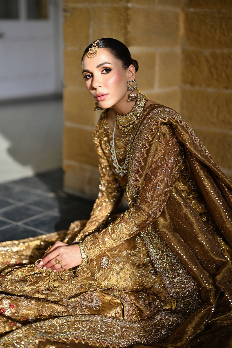 Special Embroidery handmade kora dabka zari stich This stunning bridal features a rich gold-toned base adorned with an all-over jaal of hand-embroidered zardozi, gota, dabka, and resham work.