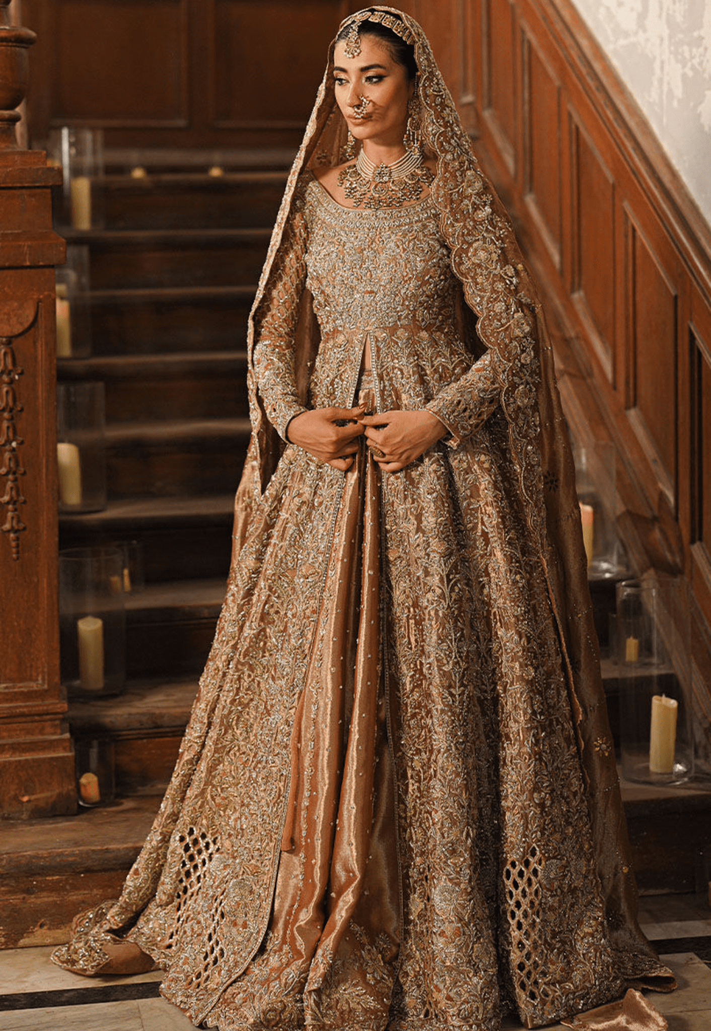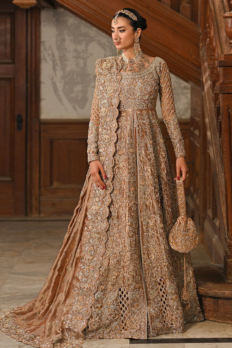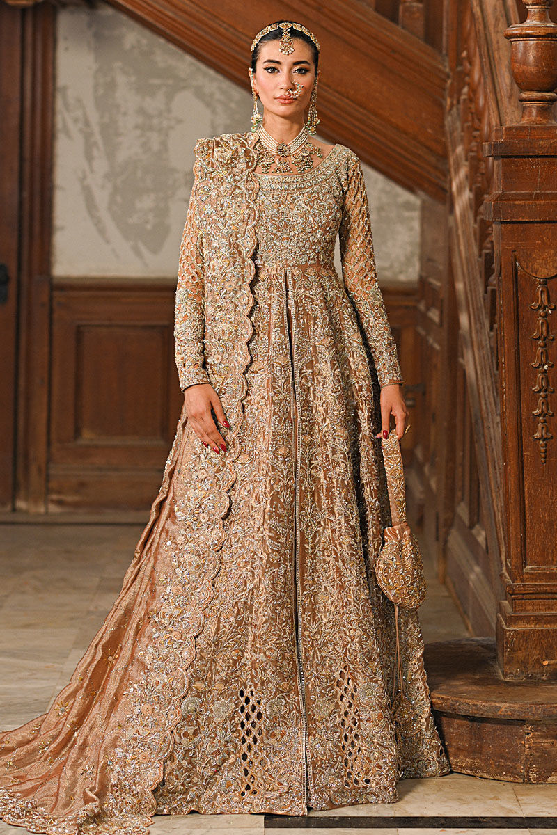 Special Embroidery handmade kora dabka zari stich  front-open antique gold lama kalidar. A masterpiece of couture, this ensemble is a harmonious blend of tradition and modernity. Adorned with meticulous handwork featuring golden and silver dabka, naqshi, Swarovski stones, and sitara, it exudes a regal aura.
