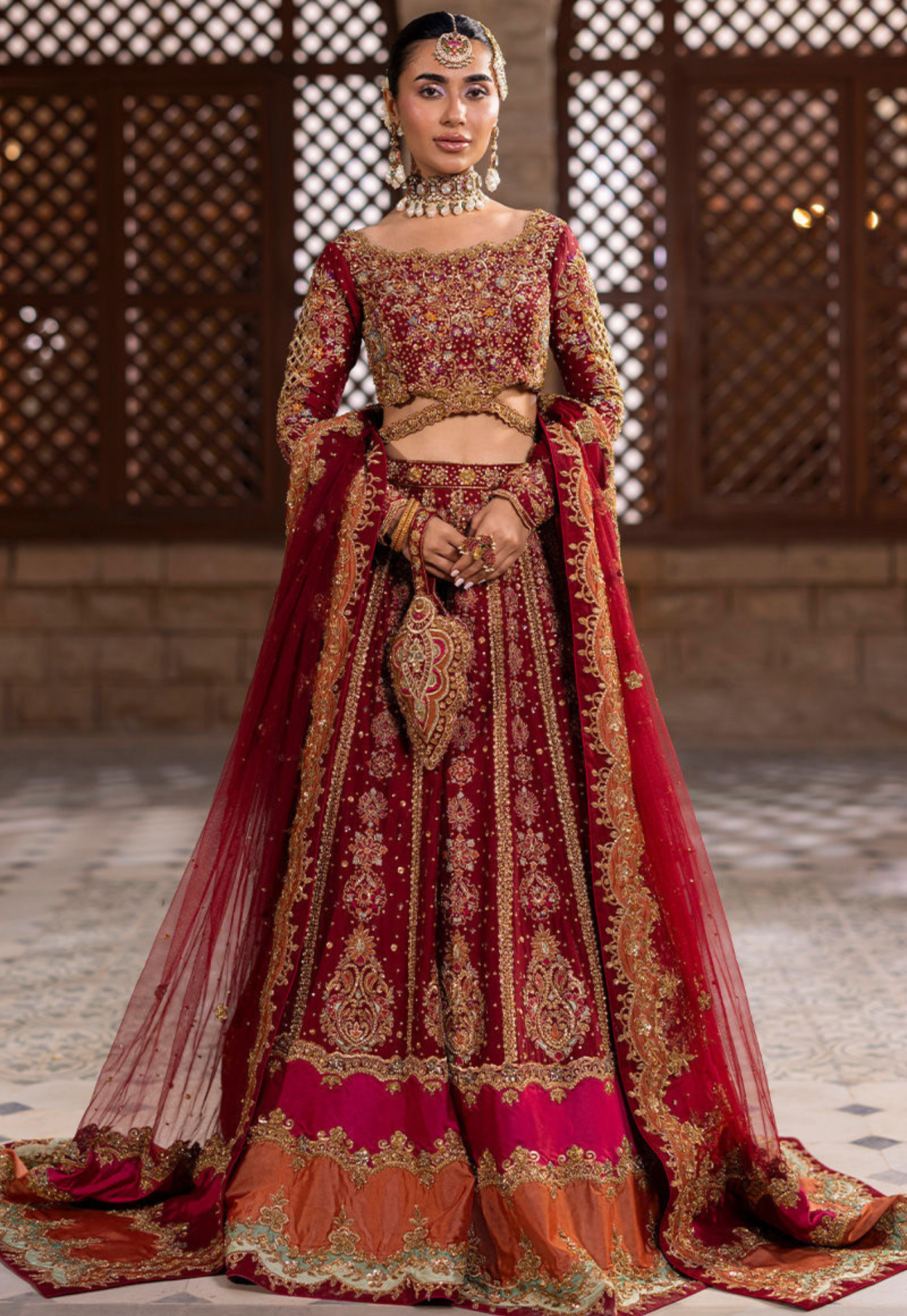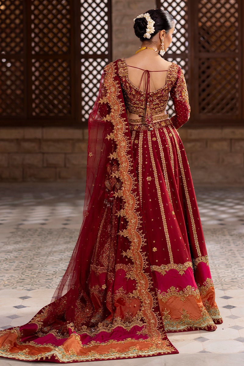 Special Embroidery handmade kora dabka zari stich An opulent oxblood lehanga choli crafted from luxurious raw silk, this ensemble radiates timeless elegance. The choli features a delicate scalloped neckline, intricate resham work, and exquisite hand embellishments