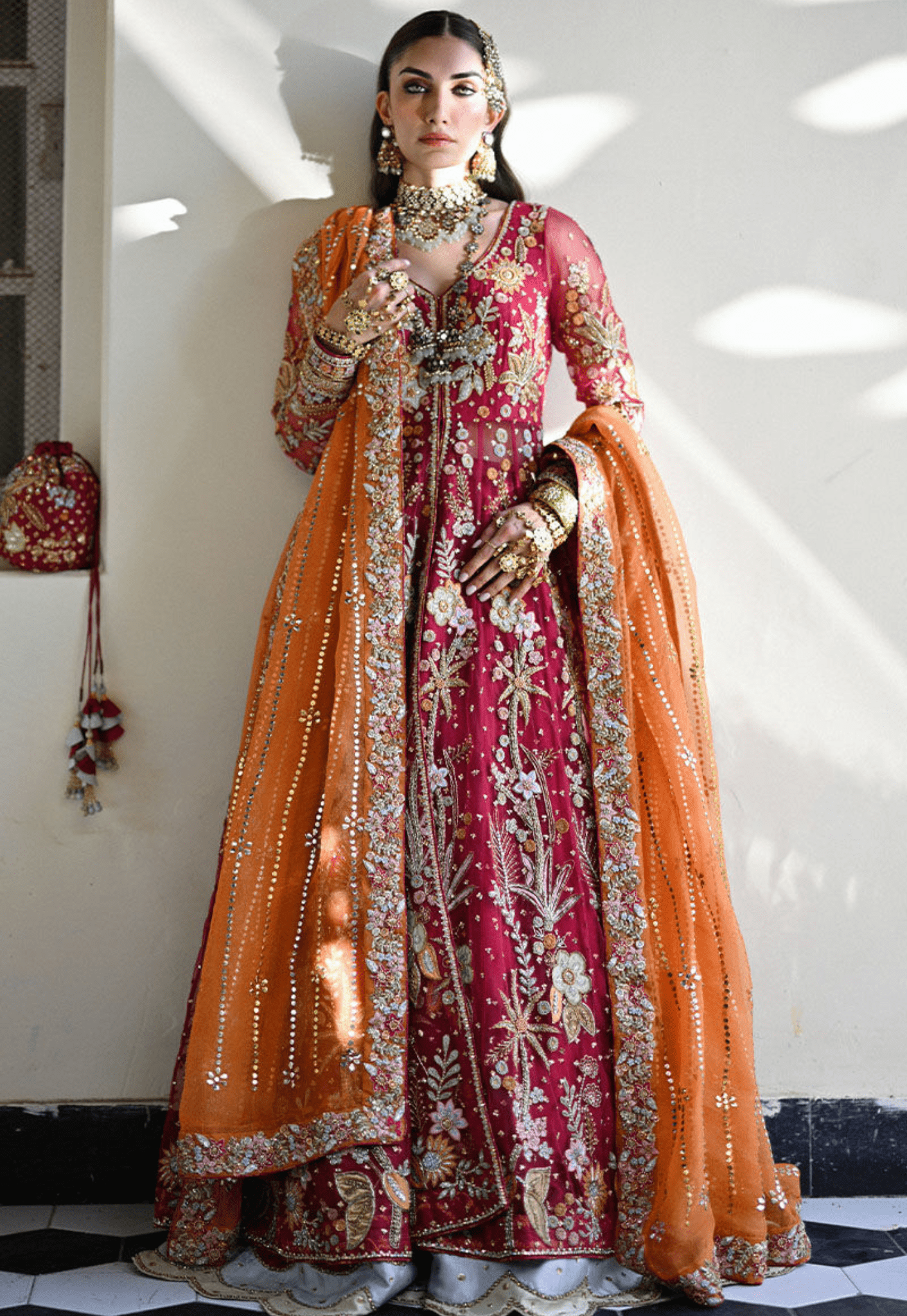 Special Embroidery handmade kora dabka zari stich This bold magenta kalidaar in net features an open front design with a deep V-neckline and long fitted sleeves. It is adorned with a mix of gold and silver dabka, nakshi, moti, cutdana, and resham.