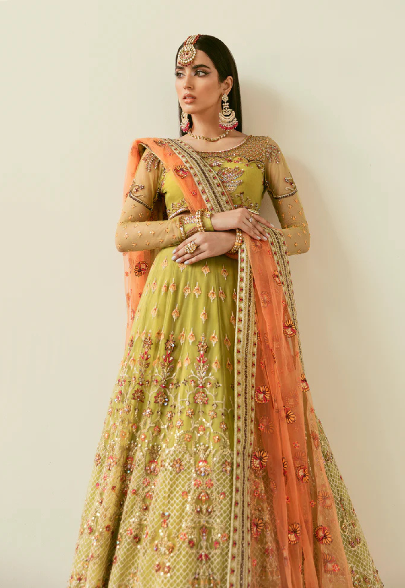 Exquisitely crafted net ensemble featuring a 6-panel hand-embellished embroidered front and back. Paired with a 26″ hand-embellished blouse (front & back), detailed with organza embroidered borders and motifs. Includes embellished net sleeves with organza borders, a 2.5-yard embroidered net dupatta finished with 8 yards of organza border, and a 5-yard cotton silk inner for added comfort. Accentuated with a 2-yard organza belt border for a refined finish.