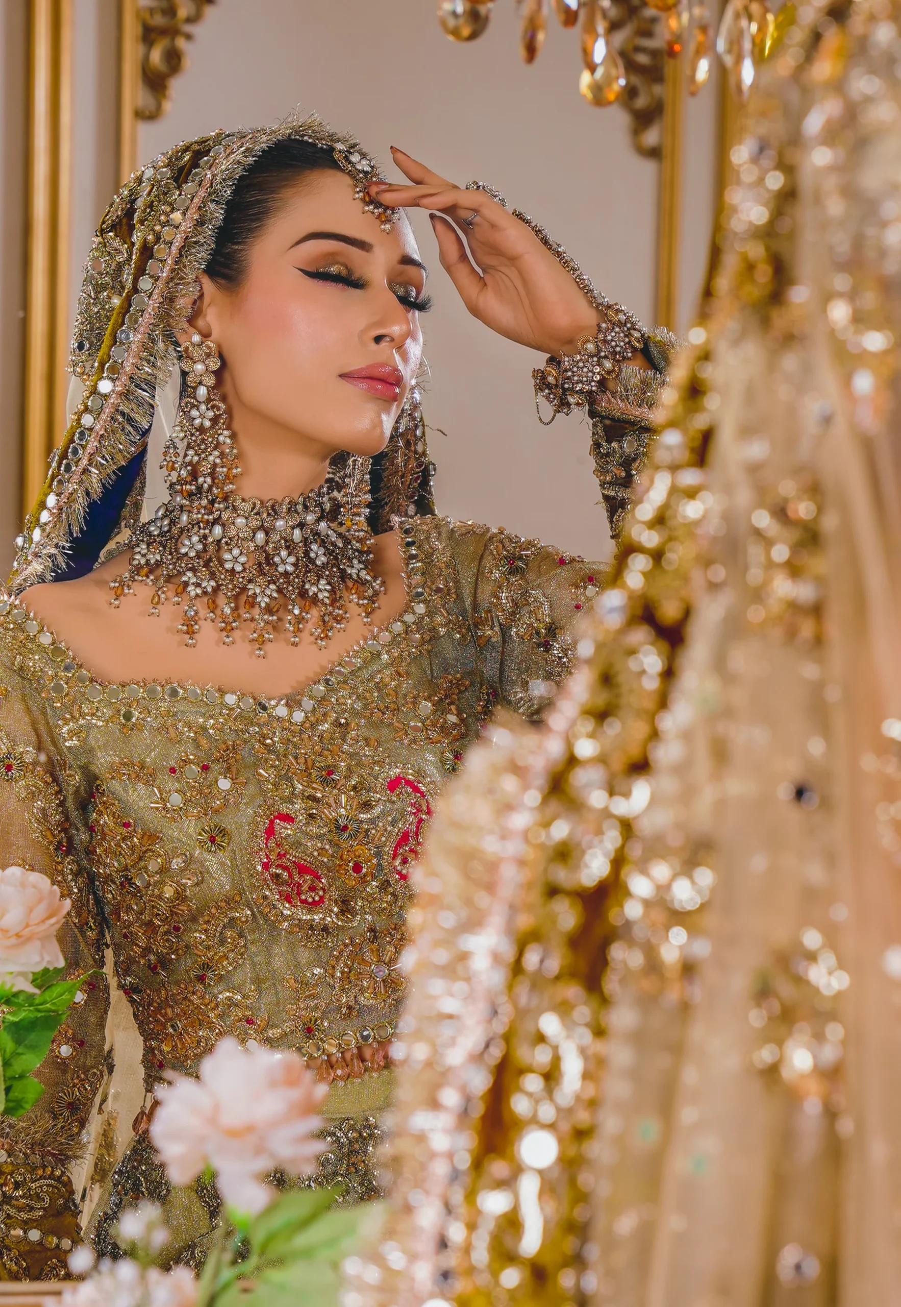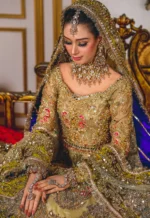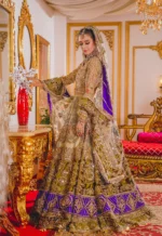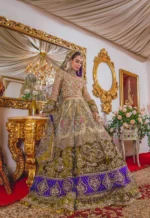 Special Embroidery handmade kora dabka zari stich This is a traditional bridal lehenga richly embellished with heavy gold embroidery, zari, dabka, and sequin work. The outfit features a golden-beige base adorned with olive green and purple detailing, giving it a regal and opulent look.