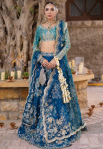 Draped in mesmerizing peacock blue, this lehnga blooms with floral patterns in radiant peacock hues, brought to life through exquisite Banarsi zardozi handwork.