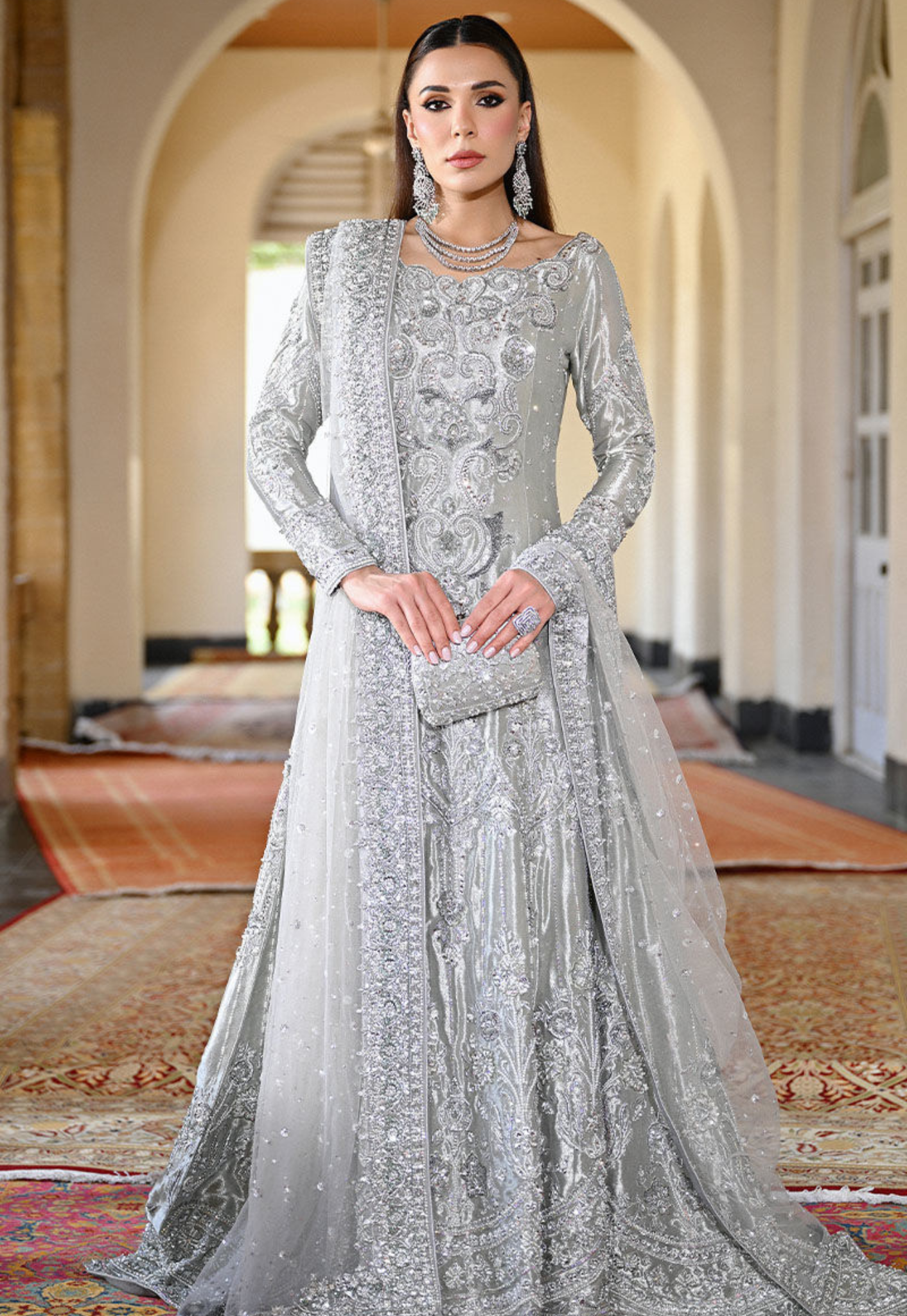 Special Embroidery handmade kora dabka zari stich A silver-toned mermaid cut gown crafted from luxurious lama, this piece features a cutwork neckline and an elegant train at the back. The gown is heavily adorned with silver embellishment, sage resham, dabka, moti, tiki stones, sequins, and cutdana for a high-impact shimmer.